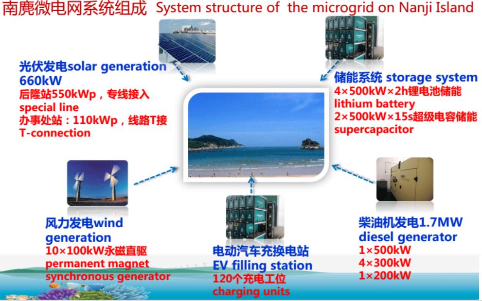 南麂岛微电网项目在岛上建设1000千瓦的风力发电系统、660千瓦的光伏发电系统、30千瓦的海流能发电系统以及储能系统,保留柴油发电系统,结合电动汽车充换电站、智能电表、用户交互等先进的智能电网技术。储能系统中的蓄电池可以储存1000千瓦电能,发电高峰时储电,当电力供应不足时可以稳定供电。岛上的电动汽车将成为储能系统的一部分进行车-网双向充放电应用。